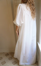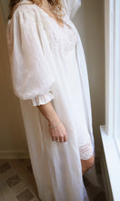 Silky white Chrisse Robe with shimmering lace detailing and puff sleeves